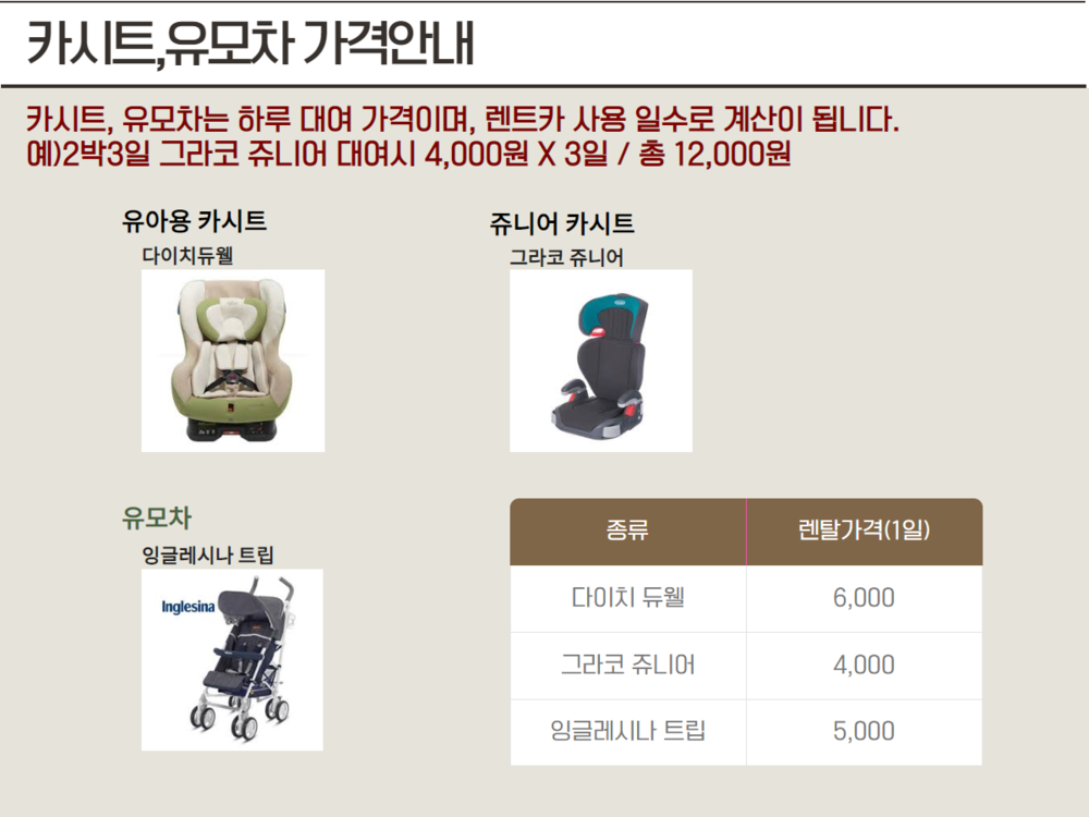 카시트/유모차 이용 금액은 시간단위(24시간)이 아닌 이용일수의 금액입니다.