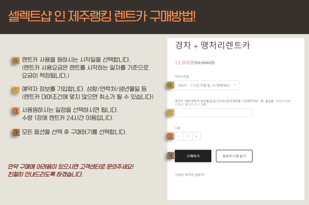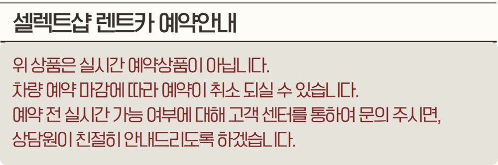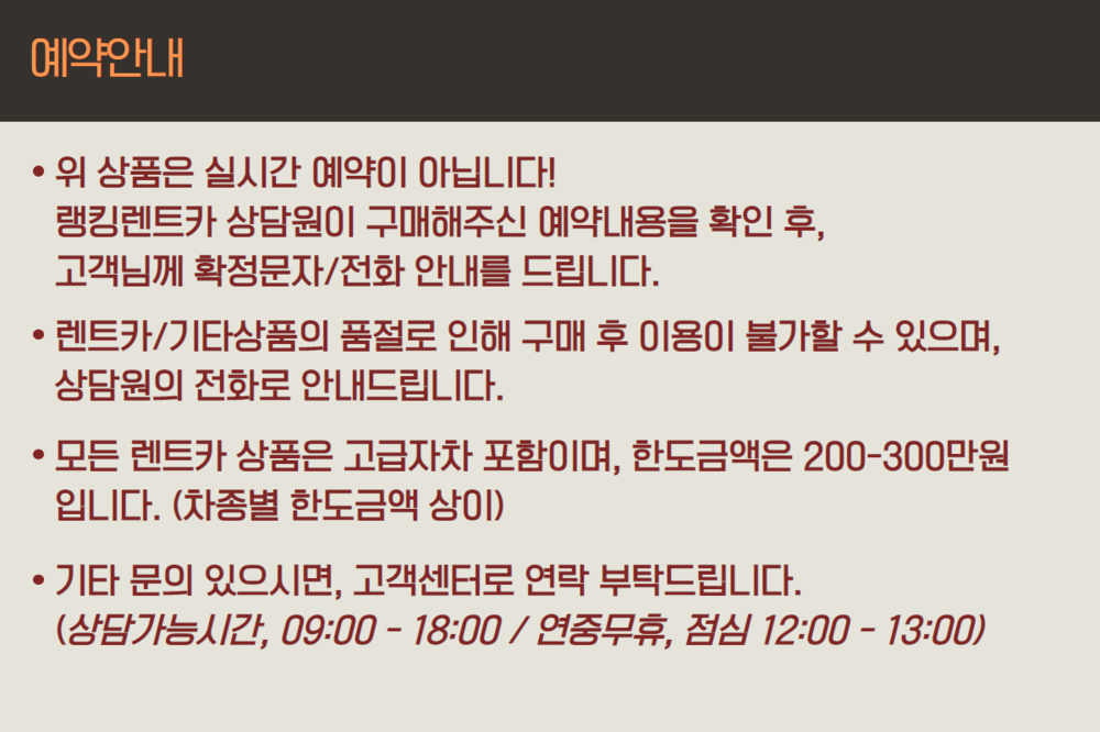 •제주도렌트카 상품 특성상 당일예약은 불가합니다! (당일사용은 유선으로 문의부탁드립니다.)